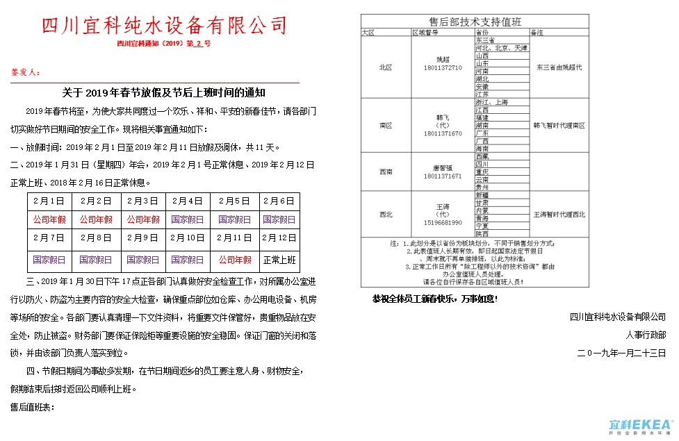 四川宜科純水2019春節(jié)放假通知